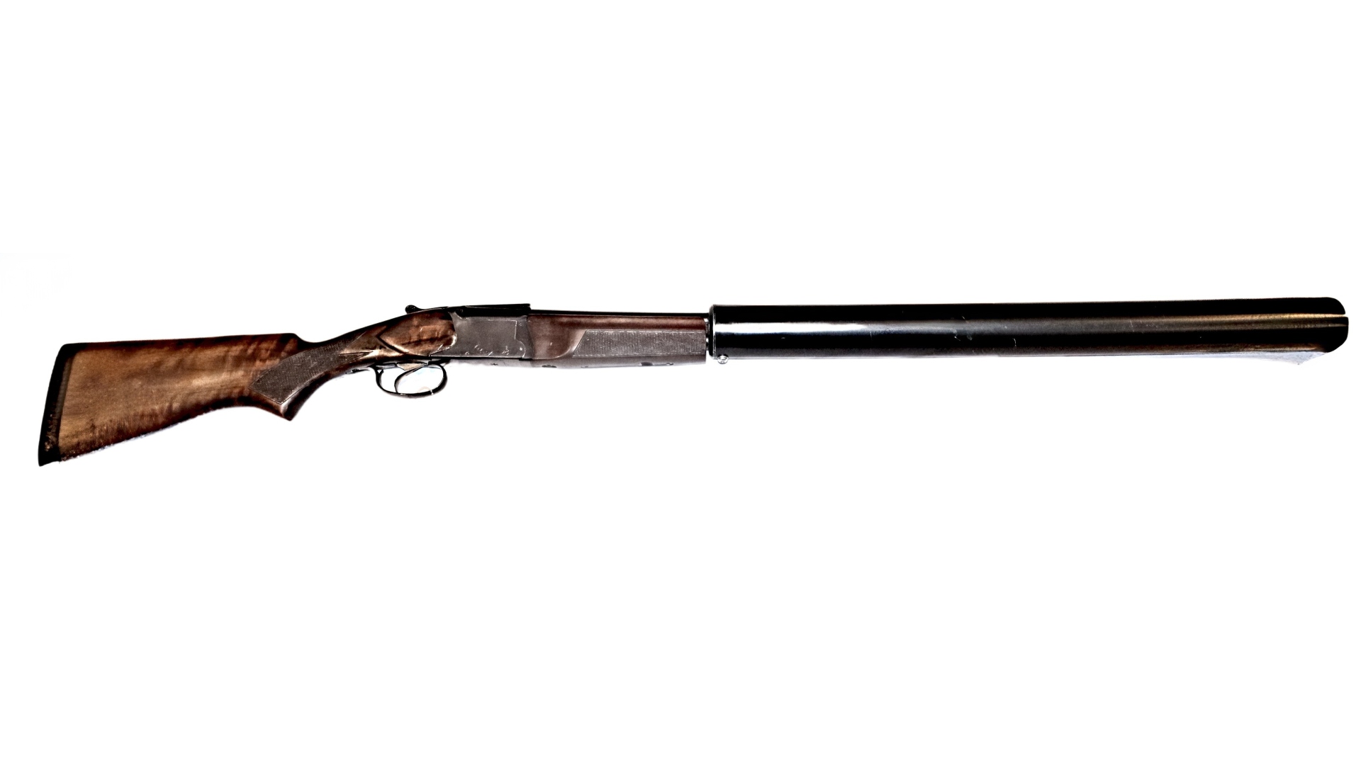 Hard to find 20 bore over and under that has been fitted with a full length moderator. The gun is a basic Baikal over and under.