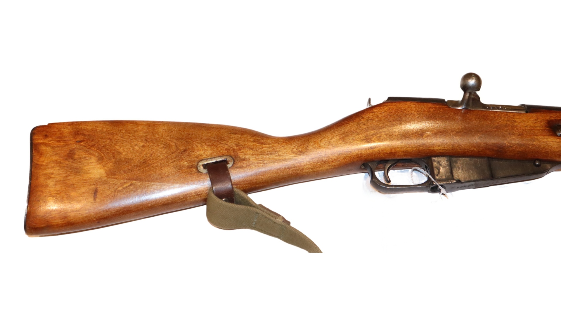Exceptional condition Moisin Nagant Model 38 Carbine in standard Russian caliber 7.62 54 R. This model was only produced for a few years and this one is dated 1943 and has all matching numbers with original canvas sling and cleaning rod.